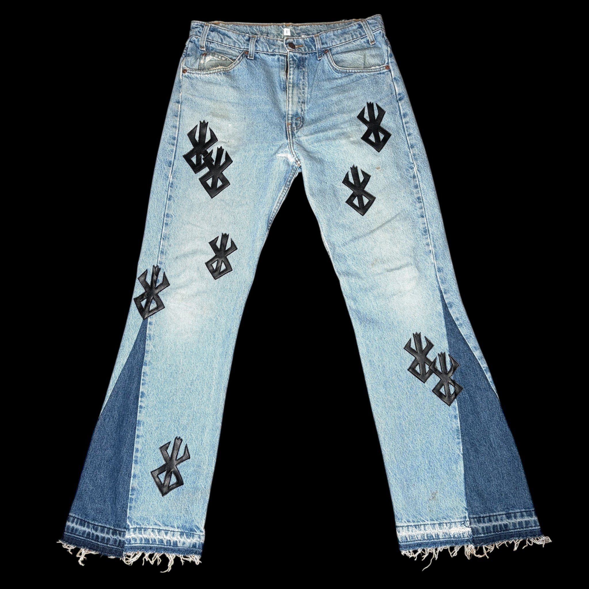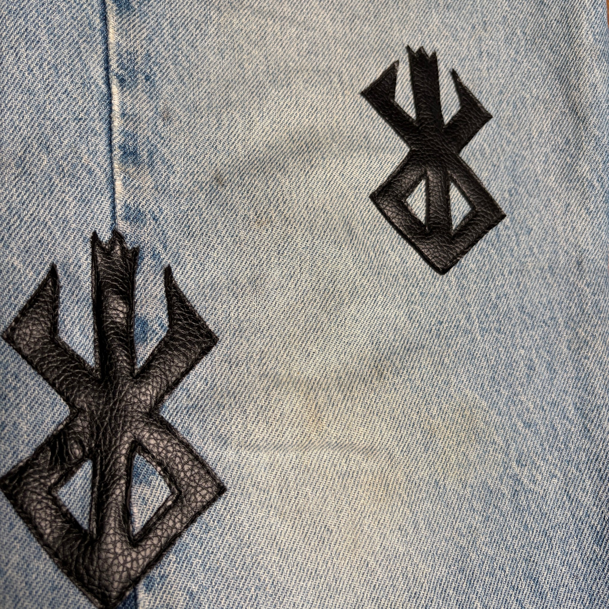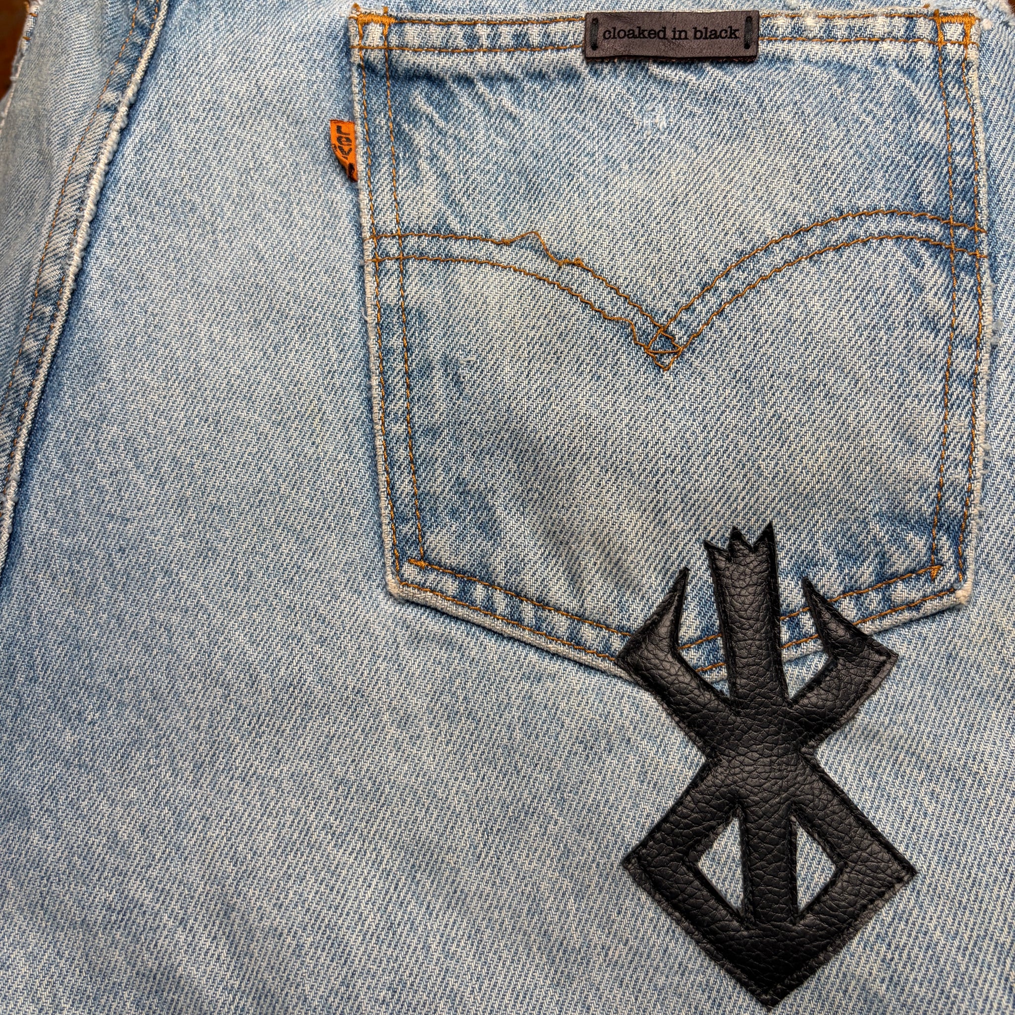 8 curated vintage orange tab Levis denim from the 1980’s/90’s with 15 Faux Leather -brand of sacrifice- patches hand cut and sewn on