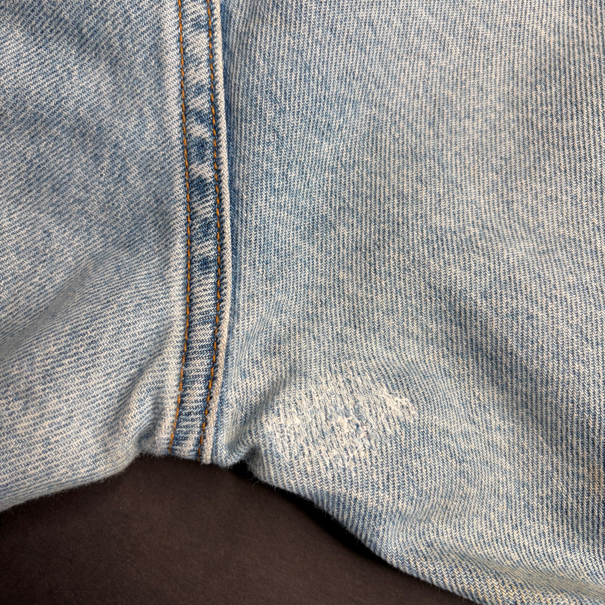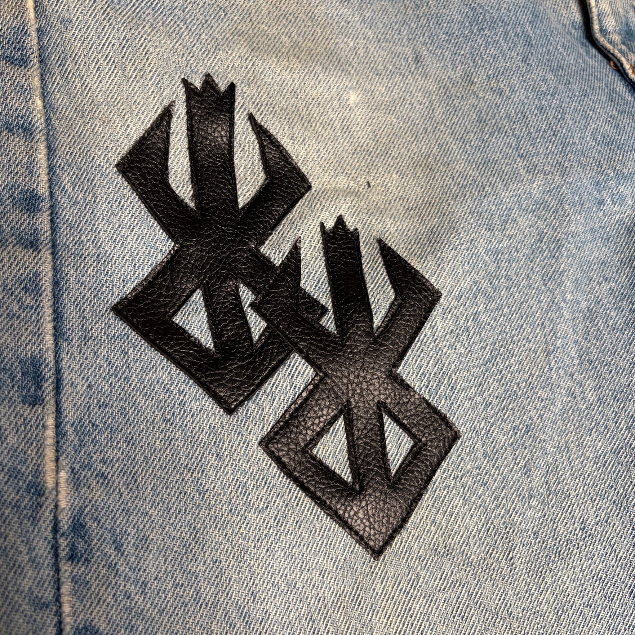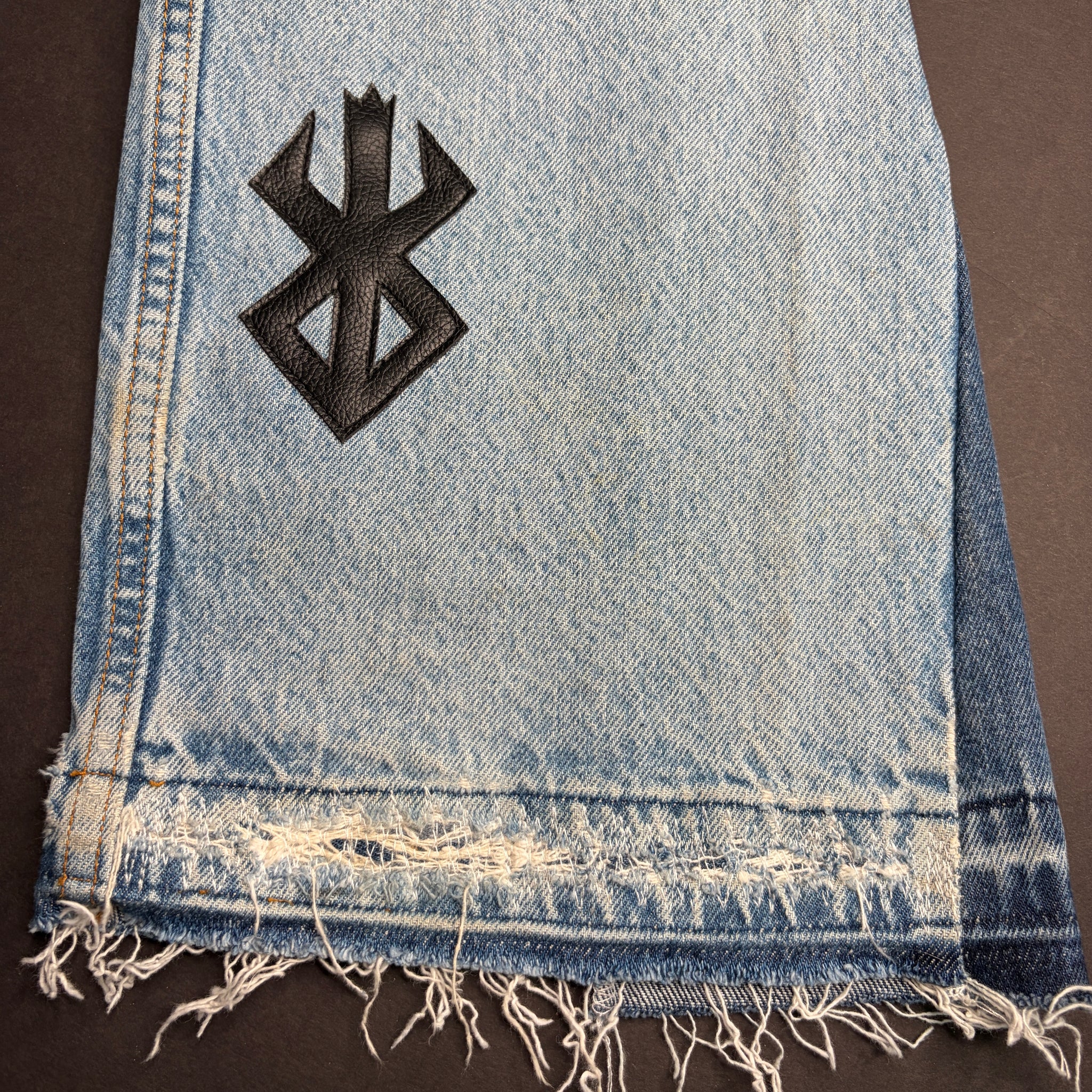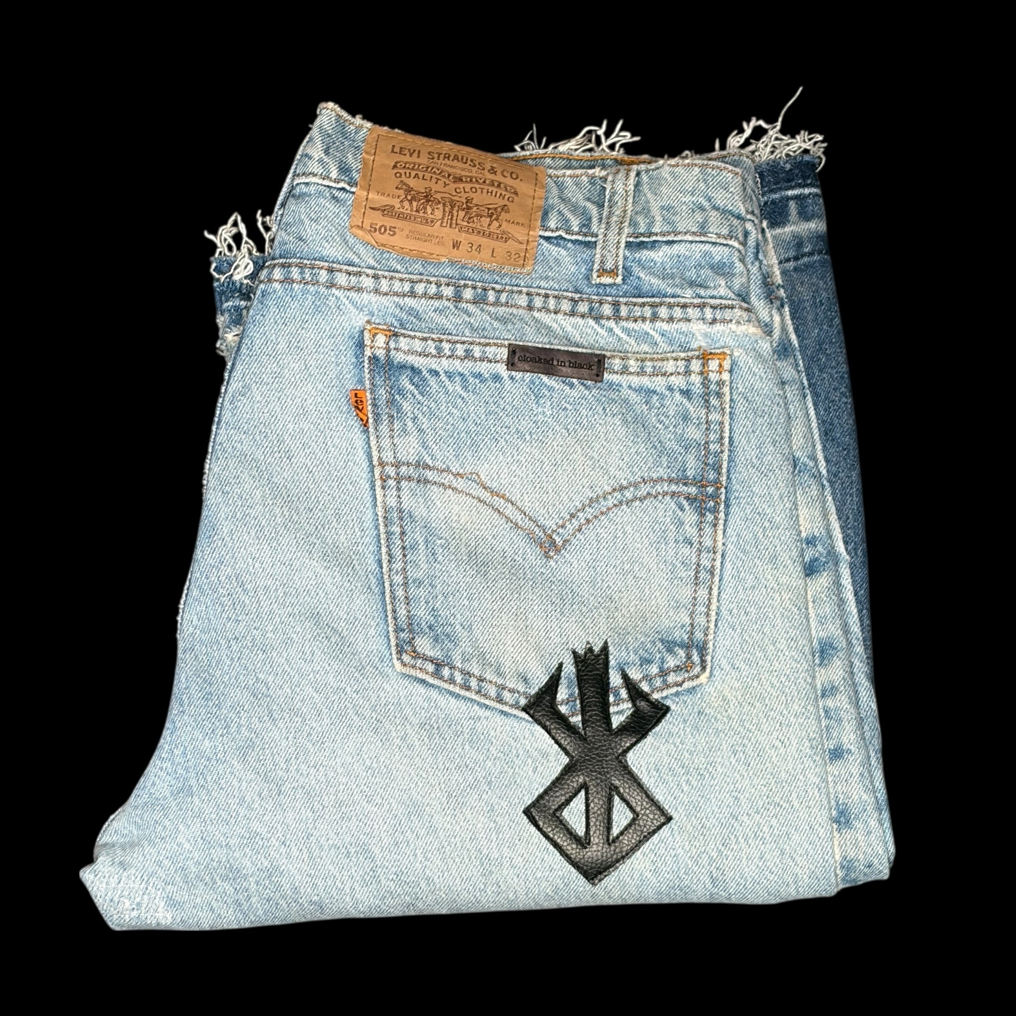 8 curated vintage orange tab Levis denim from the 1980’s/90’s with 15 Faux Leather -brand of sacrifice- patches hand cut and sewn on